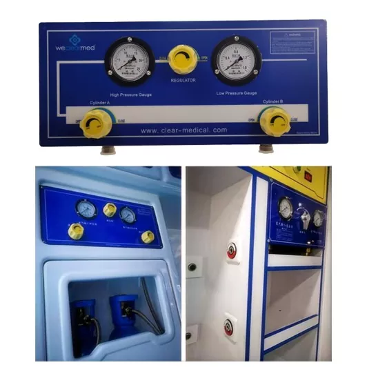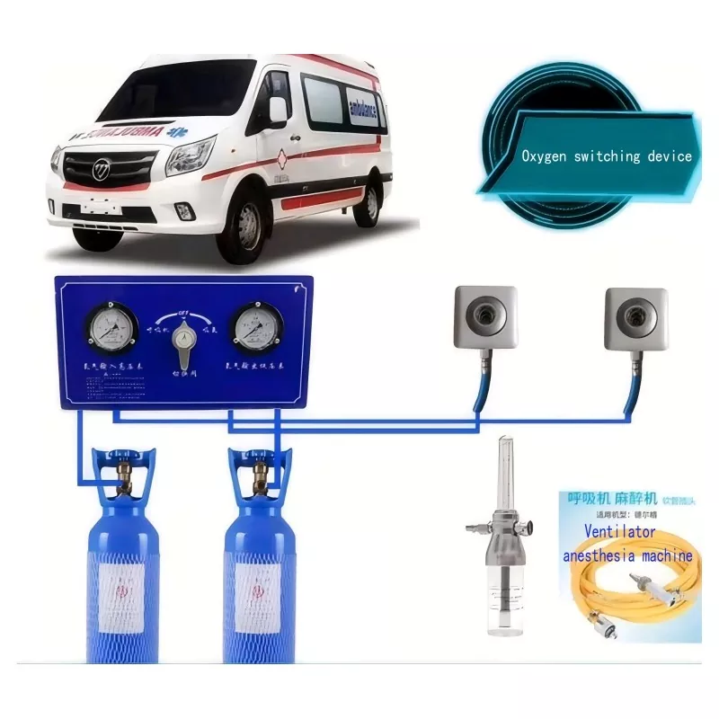 Ta reševalna enota za medicinsko plino je primerna za reševalna vozila z visoko porabo kisika. Vstavi, da je kisik z visokim tlakom s kovinsko cevjo v glavni cevi na glavni cevovod, visokotlačni kisik pa se dovaja v terminal kisika s pomočjo nizkotlačnega cevovoda po depresiji, ki ga je treba uporabiti kot vir kisika za prvo pomoč. Delovni načelo je razgraditi visokotlačni kisik v nizki tlak in ga dostaviti v terminal kisika skozi ustrezen cevovod, tako da se oskrbuje s pristaniščem kisika in ventilatorja. Nadzorno ploščo je mogoče hkrati povezati z dvema ali več kisikovih jeklenkami, da razgradimo ustekleničen visokotlačni kisik do določenega tlaka, kar je nekakšna oprema za centralizirano oskrbo s plinom. Nadzorna plošča je sestavljena iz visokotlačnega cevovoda iz kovinske cevi, ki je povezan s kisikovimi jeklenki prek niti G5/8. Vsak kisikov valj je povezan s kontrolno ploščo z ustreznim visokotlačnim preklopnim ventilom, ki nadzoruje ustrezen visokotlačni cevovod. Visokotlačni cevovod, ki povezuje vsak kisikov valj na zadnjem koncu stikalnega ventila, je med seboj povezan, razdelilnik pa je opremljen s priključkom TEE na sredini razdelilnika, da poveže meter visokega tlaka, regulator in visokotlačni cevovod v seriji. Merilnik z visokim tlakom se uporablja za spremljanje tlaka kisika v cevovodu visokega tlaka nadzorne plošče, regulator pa se uporablja za uravnavanje visokega tlačnega kisika do potrebnega tlaka in nato izhodi na nizko tlačni terminal. Konec nizkega tlaka je povezan s terminalom kisika, varnostnim ventilom in merilnikom z nizkim tlakom, ki se uporablja za spremljanje tlaka v nizkotlačnem cevovodu nadzorne plošče, medtem ko varnostni ventil samodejno izčrpa plin, ko je izhodni tlak višji od načrtovalnega tlaka, da se zagotovi varnost in stabilnost tlaka. Ta sistem je primeren za kateri koli kraj, kjer je potrebno preklop konvergence plina za spremljanje preostale količine tlaka plina in plina, kot so: bolnišnice, reševalna vozila, nafta, utekočinjene naftne bencinske črpalke ter druga industrijska in rudarska podjetja in institucije.