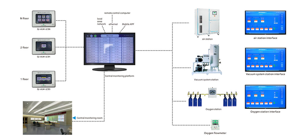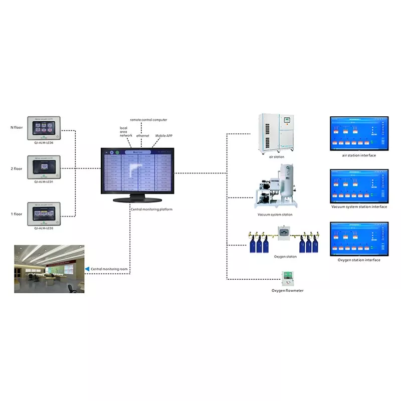 6. Ko je centralizirani sistem spremljanja povezan z Ethernetom, je mogoče realizirati oddaljeno delovanje in skupno rabo omrežja. Standardni vmesnik RS485 zagotavlja vse signale alarma v realnem času in izhod tlaka
